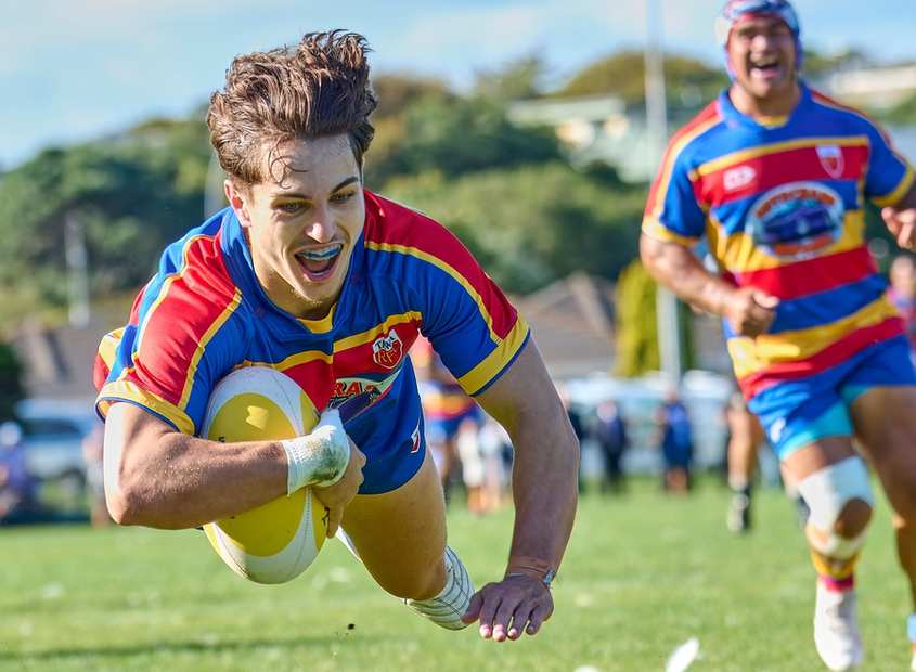 Above: Jacob Denyer scores his try against Petone in round two. Photo: Jun Tanlayco
