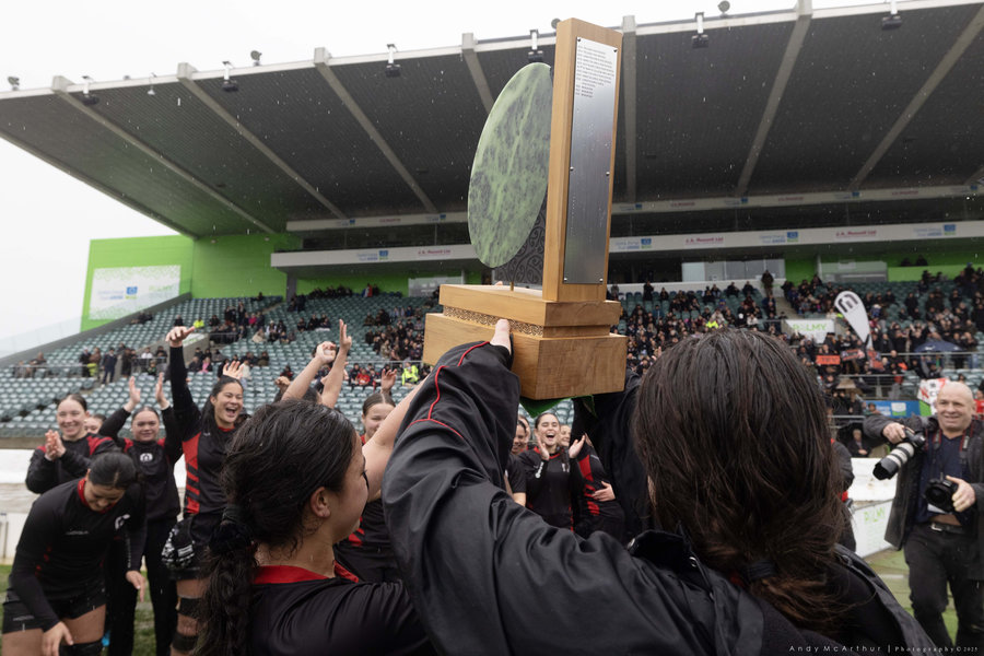 Manukura won their third straight NZSS Top 4 girls title and lifted the Hine Pounamu Trophy into the wet sky at Arena Manawatu, beating Hamilton Girls’ High School 20-17 with a last-play try. PHOTO: Andy McArthur.